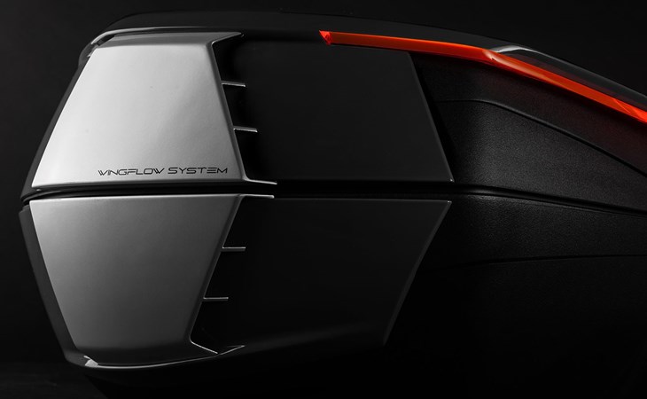 Das Highlight des V49 AIR ist das innovative Wingflow-System. Statt den Fahrtwind einfach nur zu blockieren, nutzt dieses Case integrierte Flügel (Flossen), um die Luftströmung aktiv zu lenken.